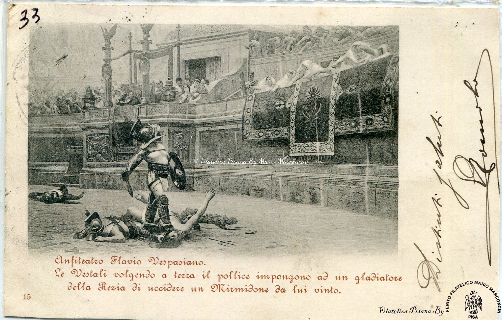 Anfiteatro Flavio Vespasiano. Le Vestali volgendo a terra il pollice impongono a un gladiatore della Rezia di uccidere un Mirmidone da lui vinto