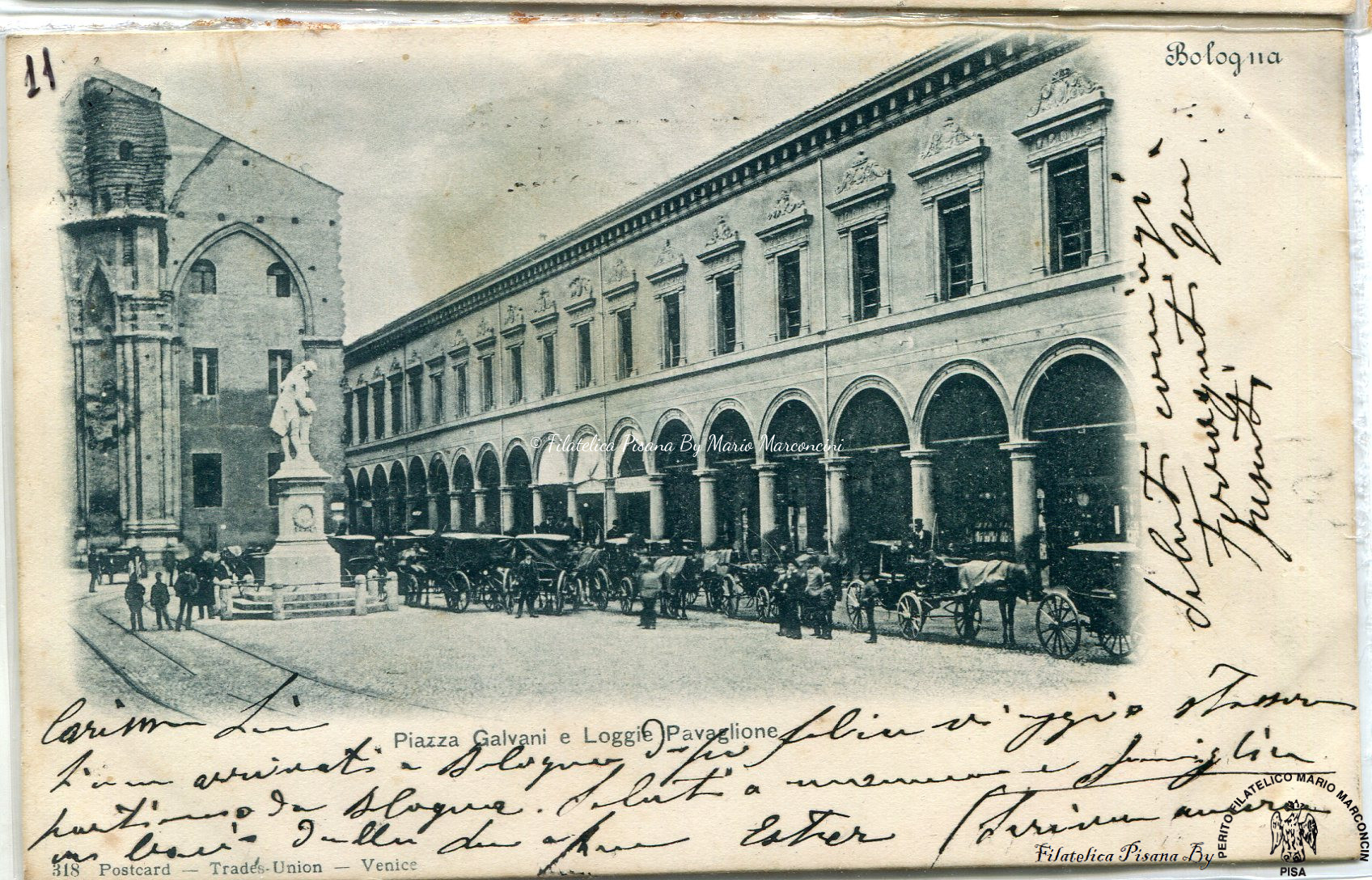 Cartolina illustrata. Bologna – Piazza Galvani e Logge Pavaglione
