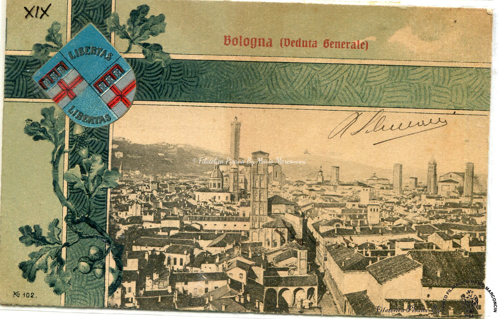 Cartolina illustrata. Bologna – Veduta generale. Stemma Libertas