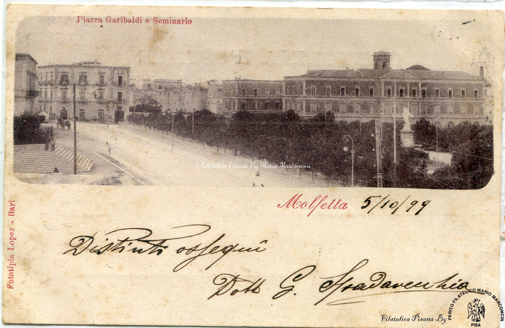 Cartolina illustrata Molfetta. Piazza Garibaldi e Seminario