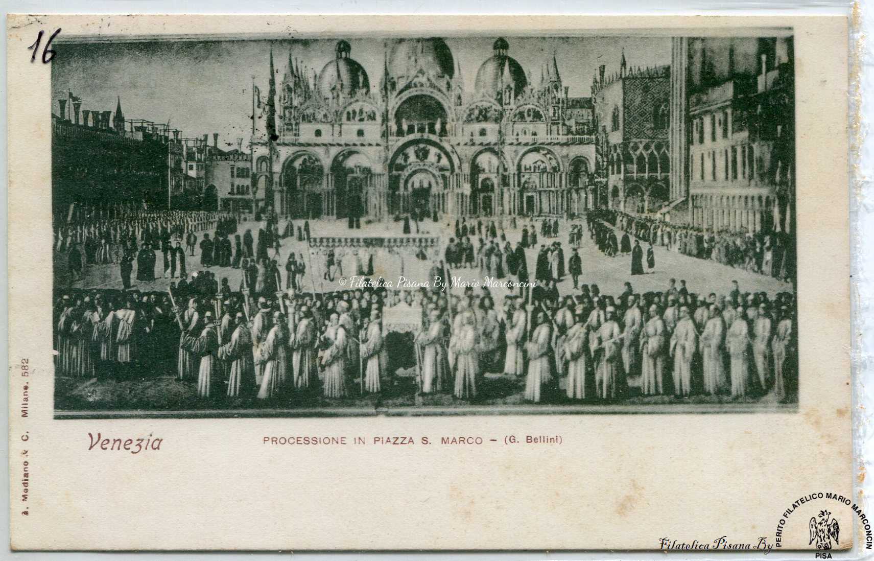 Cartolina illustrata Venezia. Processione in Piazza S. Marco (G. Bellini)