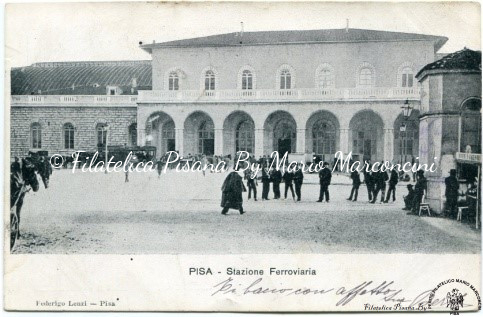 Cartolina illustrata – Pisa, veduta Stazione ferroviaria Nuova – Piazzale preso dalla Barriera di via Battisti