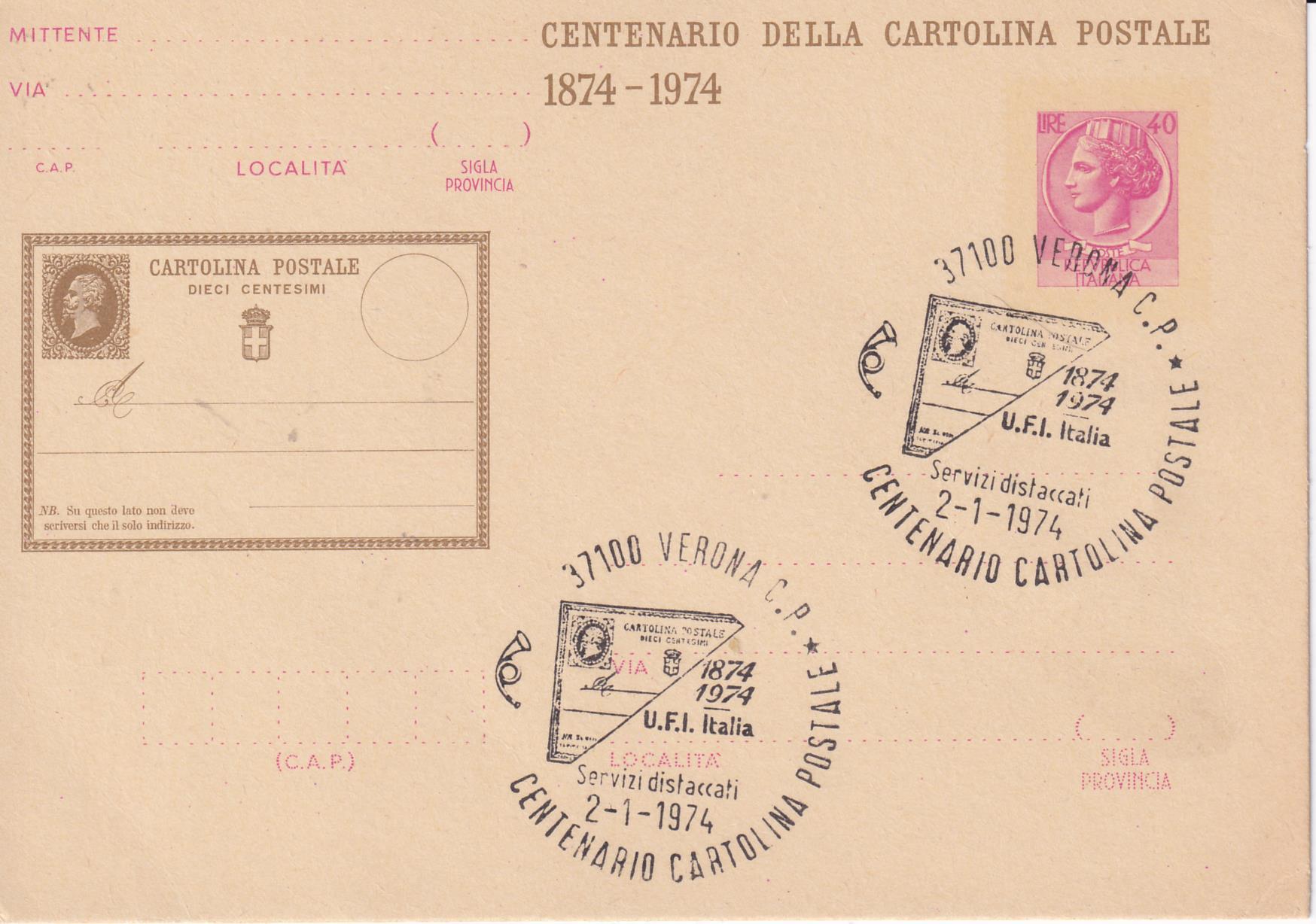 Cartolina postale Italia Repubblica ANNULLO SPECIALE PRIMO GIORNO DI EMISSIONE (FDC) Verona 02/01/1974 SIRACUSANA Centenario della prima cartolina postale Lire 40 lilla (cat. n. 174)