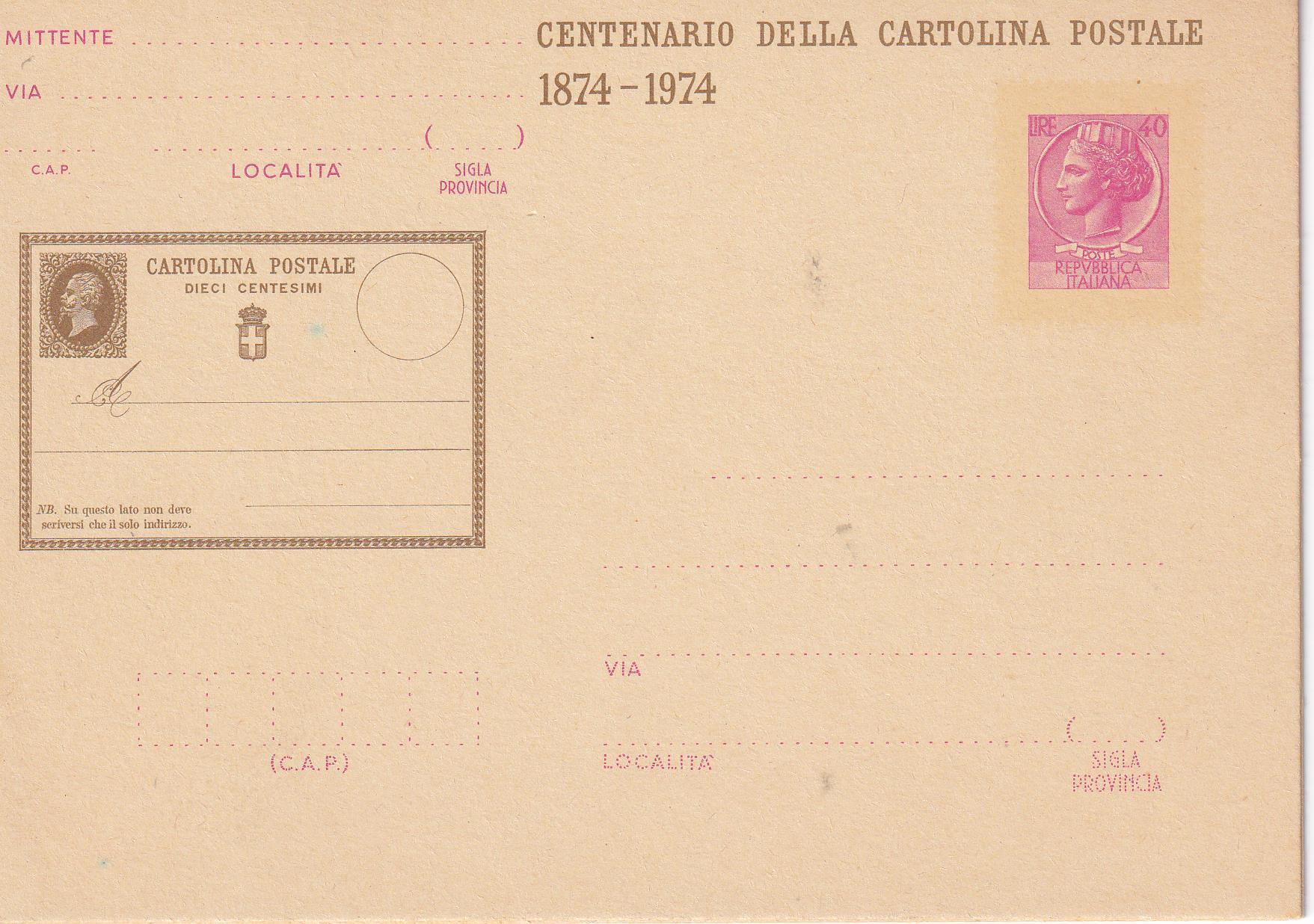 Cartolina postale Italia Repubblica NUOVA 02/01/1974 SIRACUSANA Centenario della prima cartolina postale Lire 40 lilla (cat. n. 174)