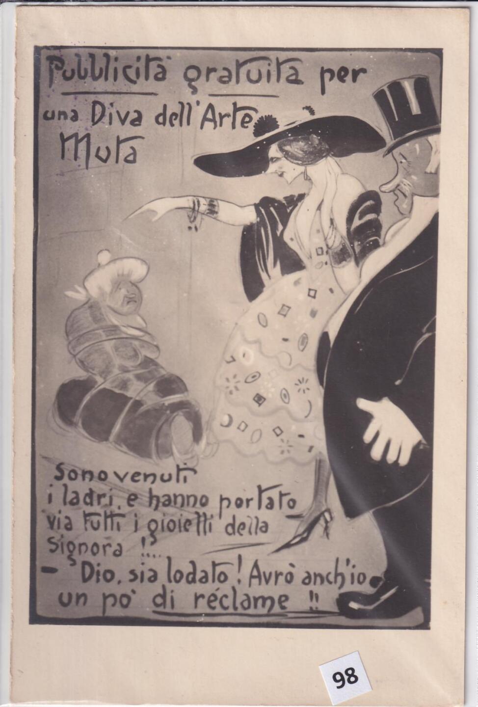 Cartolina satirica d’epoca PUBBLICITA’ GRATUITA PER UNA DIVA DELL’ARTE MUTA