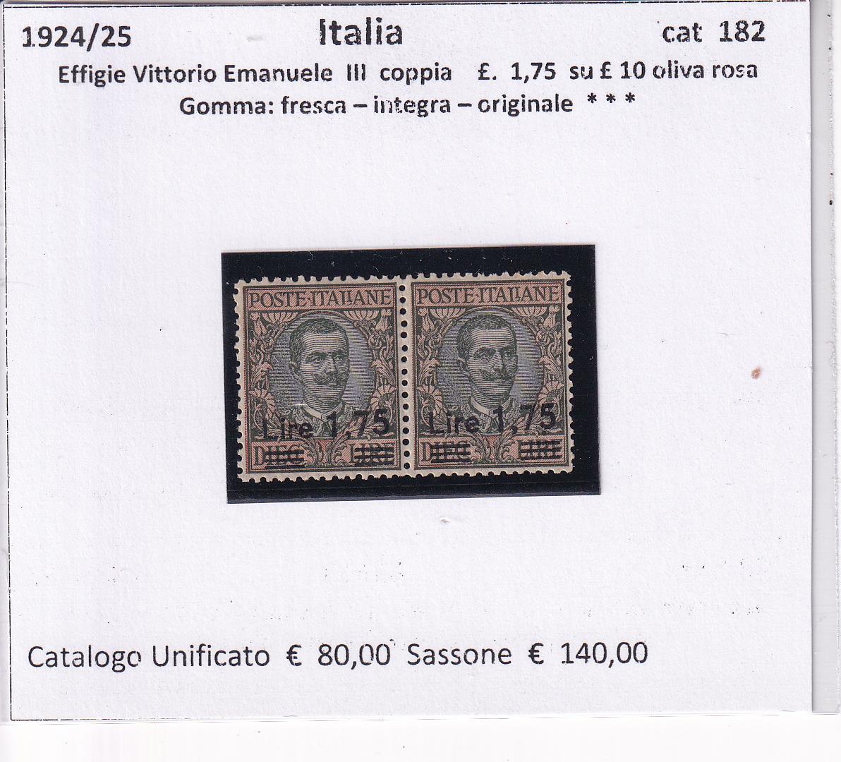 Coppia di francobolli Regno d’Italia, Anni 1924-1925, Effigie Vittorio Emanuele III Sovrastampati Lire 1,75 su Lire 10 oliva rosa (cat. n. 182)