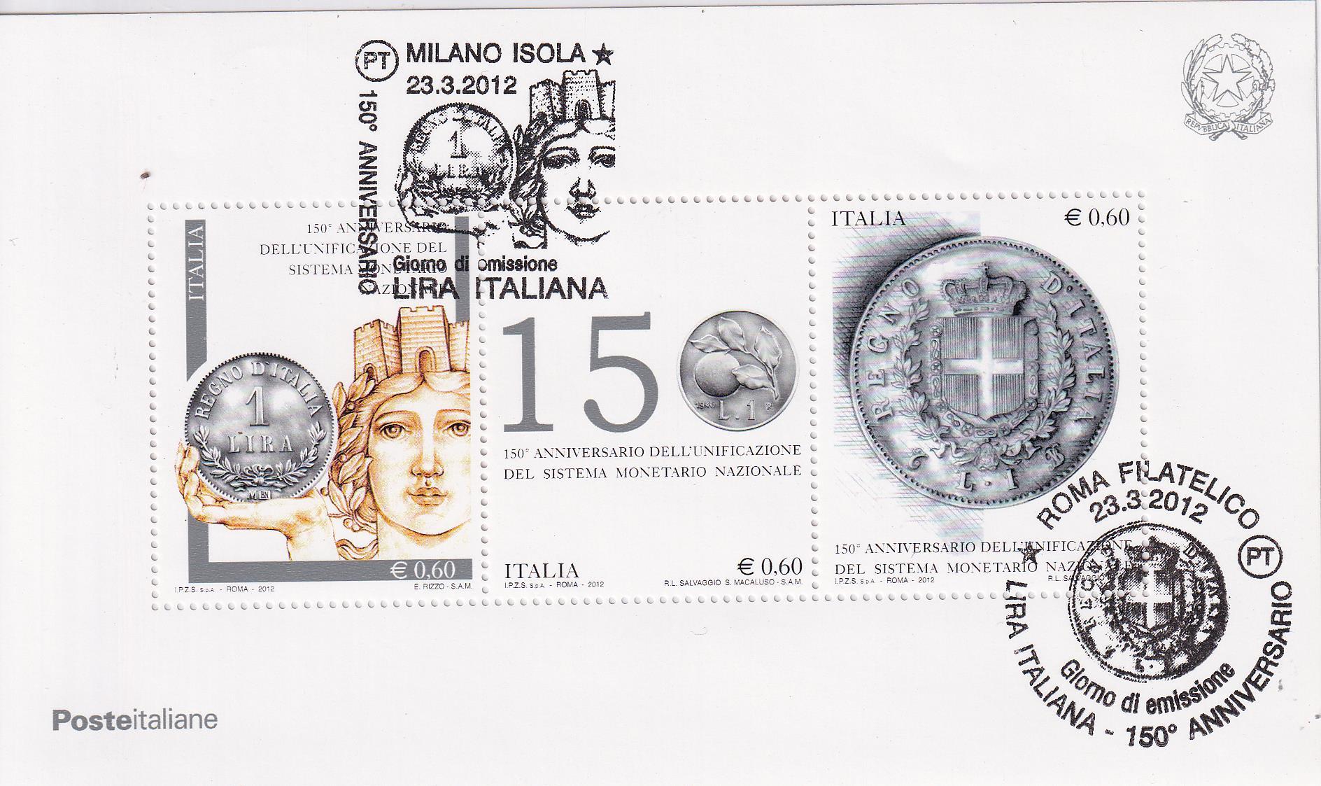 Foglietto Italia Anno 2012 150esimo Anniversario Unificazione Sistema Monetario Nazionale (BF n. 74) Annullo speciale