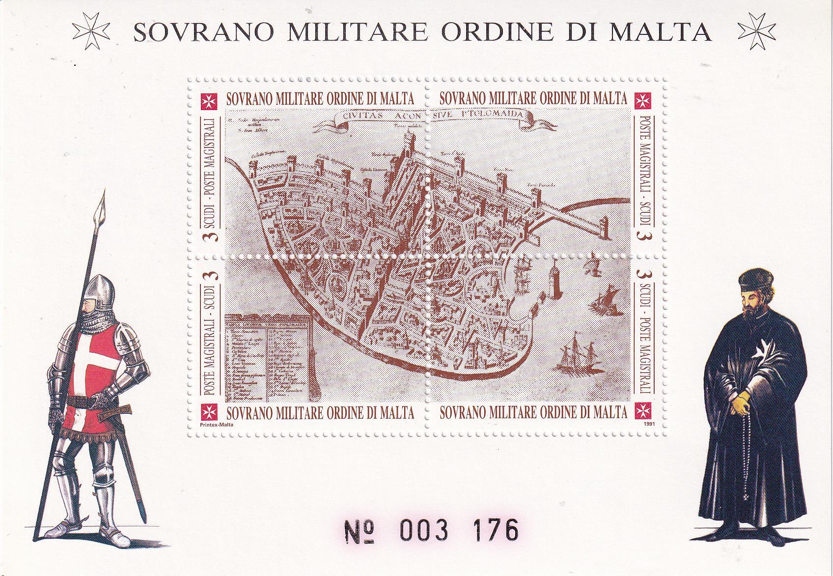 Foglietto S.M.O.M. Anno 1991 Antiche fortezze dell’Ordine. Seconda serie. Fortezza di San Giovanni d’Acri in Palestina (BF n. 31)