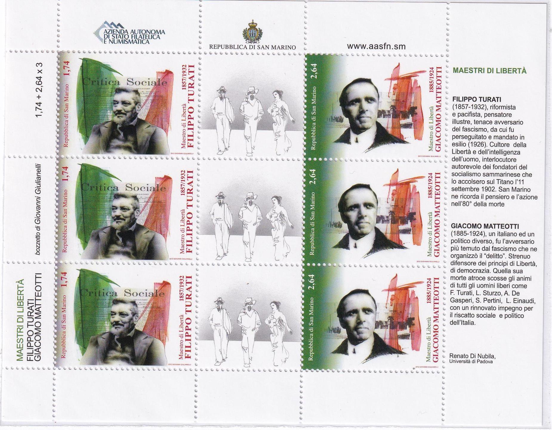 Foglietto San Marino Anno 2012 Maestri di libertà. Quarta serie. Filippo Turati politico e giornalista e Giacomo Matteotti politico (BF n. 122)