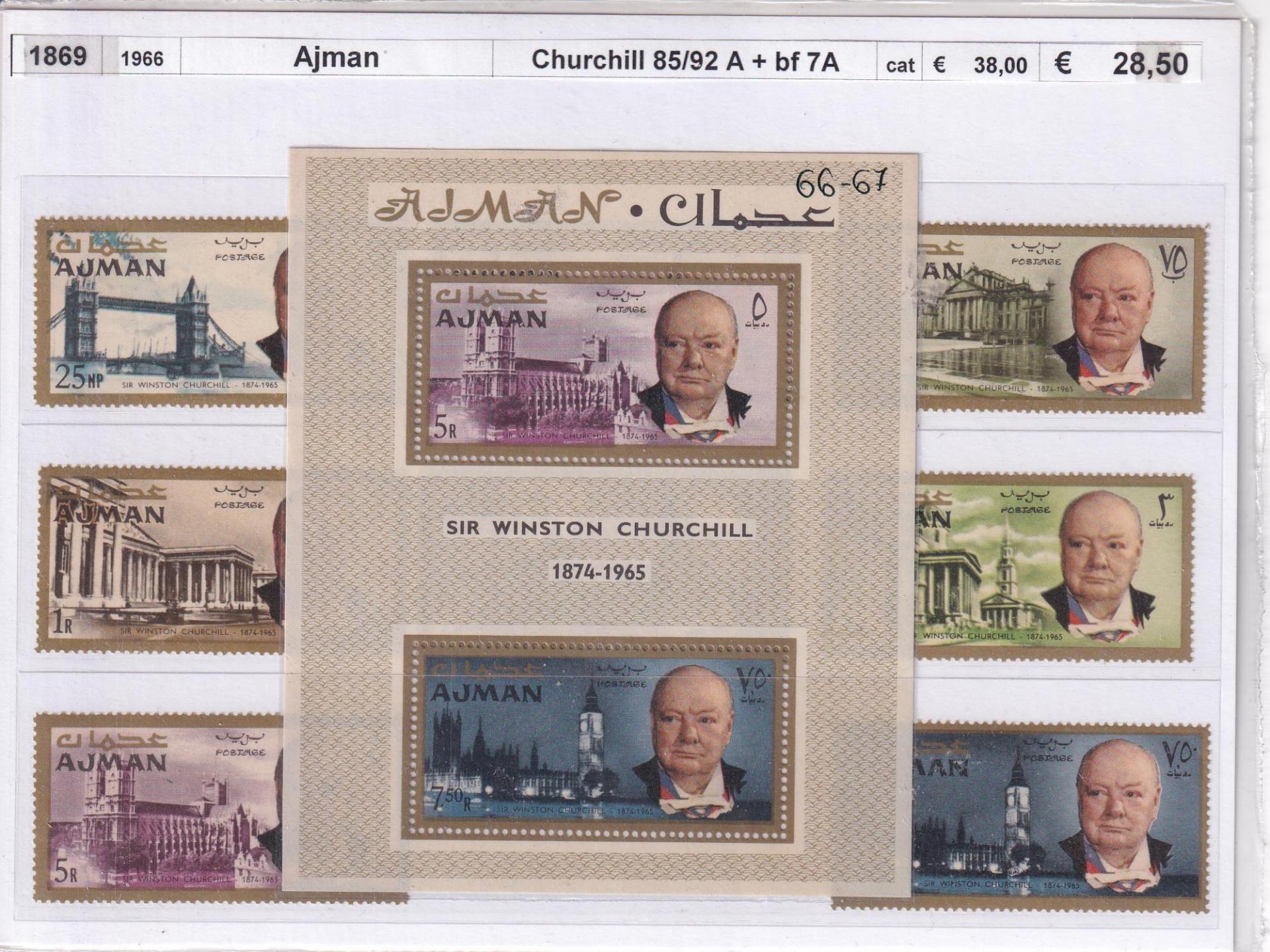 Francobolli e Foglietto Ajman, Anno 1966, Churchill (Pa n. 85-92, BF n. 7A)