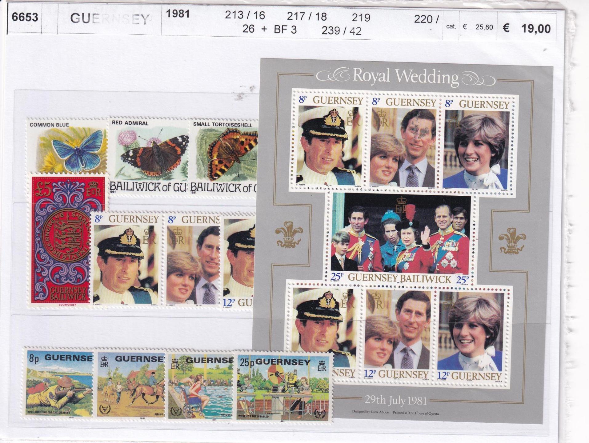 Francobolli e Foglietto Guernsey, Anno 1981, Varie emissioni (cat. n. 213-216, n. 217-218, n. 219, n. 220-226, n. 239-242, BF n. 3)