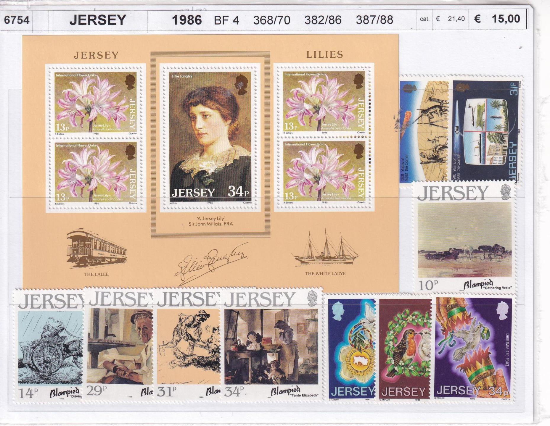 Francobolli e Foglietto Jersey, Anno 1986, Varie emissioni (cat. n. 368-370, n. 382-386, n. 387-389, BF n. 4)