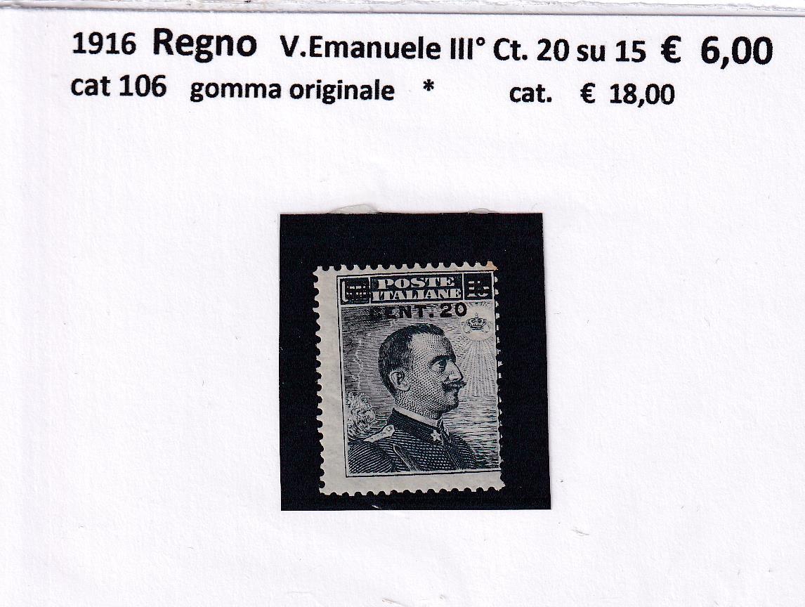 Francobolli Regno d’Italia Anno 1916 Serie ordinaria Effigie Vittorio Emanuele III Sovrastampato Centesimi 20 su Centesimi 15 (cat. n. 106) Michetti