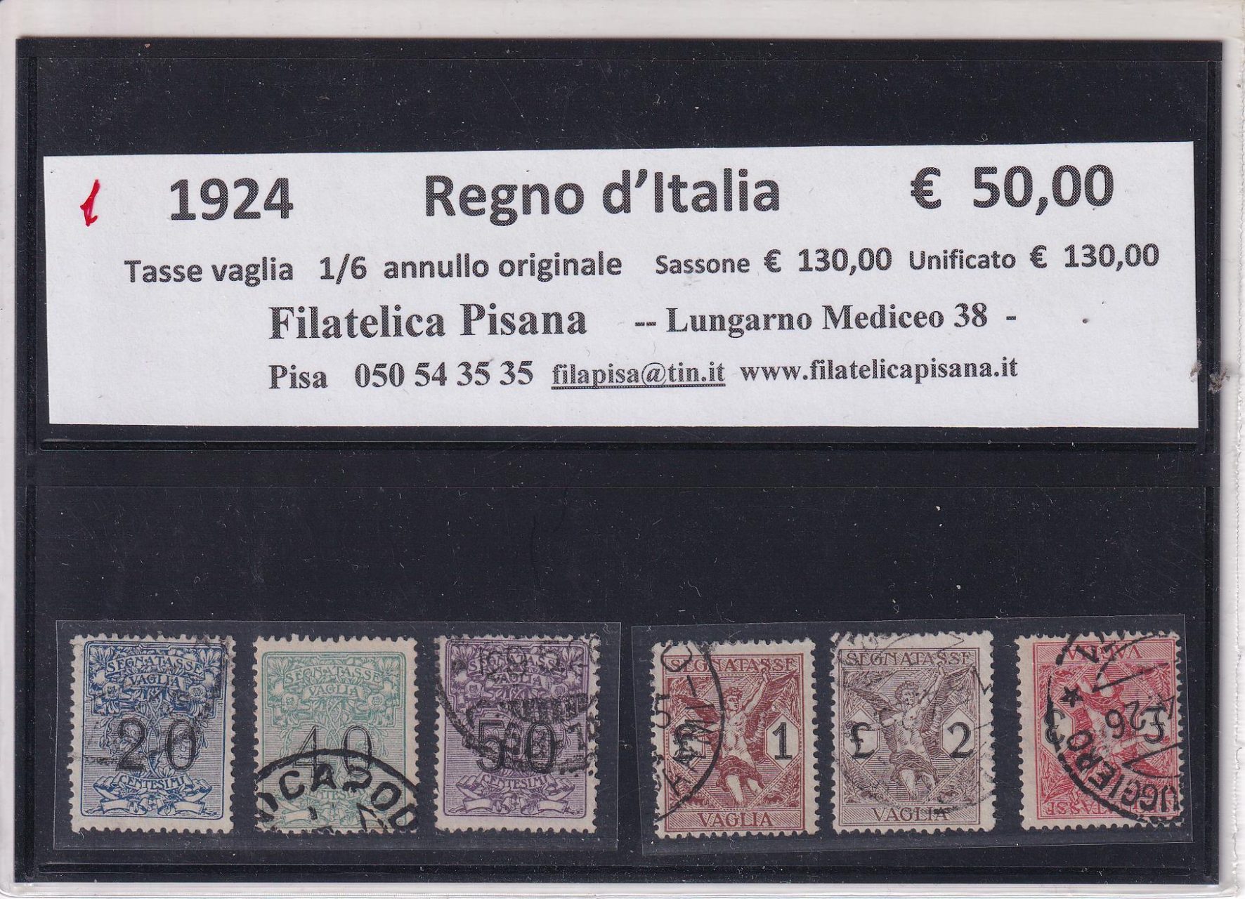 Francobolli Regno d’Italia Anno 1924 Serie completa Tasse per Vaglia (cat. n. 1-6)