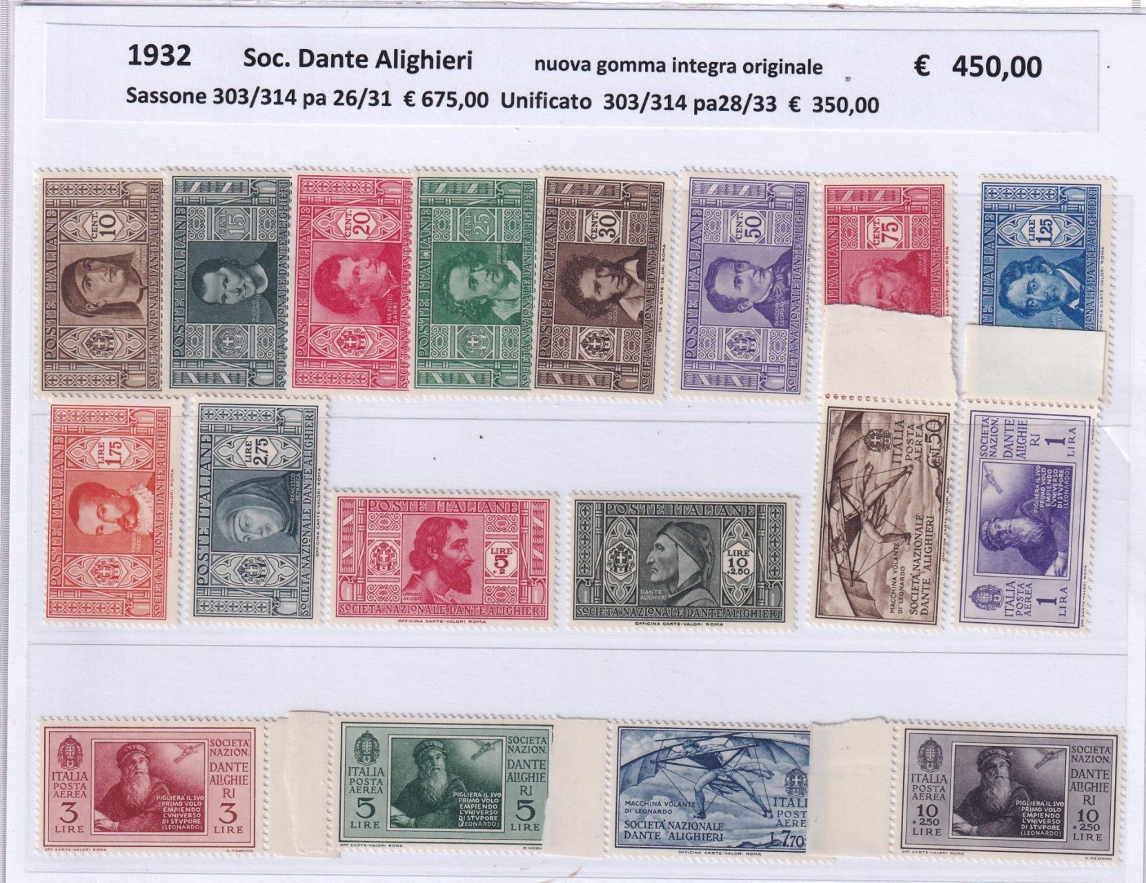 Francobolli Regno d’Italia Anno 1932 Serie completa Società Nazionale Dante Alighieri + Posta Aerea (cat. n. 303-314 + PA n. 28-33)