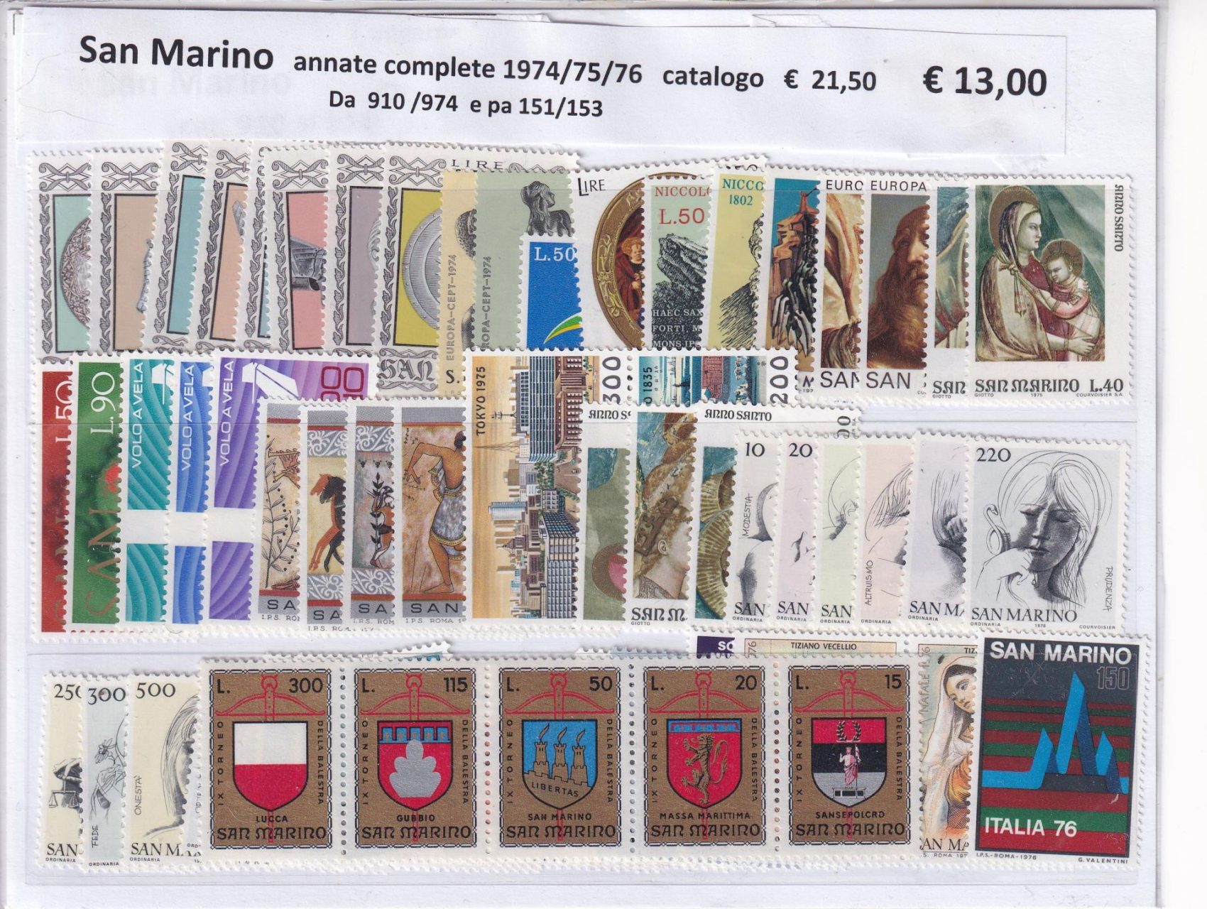Francobolli San Marino Annate complete 1974, 1975, 1976 + Posta Aerea Tematiche Stemmi, Quadri, Europa, Natale, Aerei, Vedute