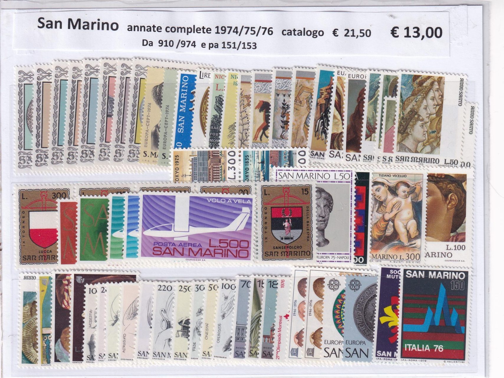 Francobolli San Marino Annate complete 1974, 1975, 1976 + Posta Aerea Tematiche Stemmi, Quadri, Europa, Natale, Aerei, Vedute