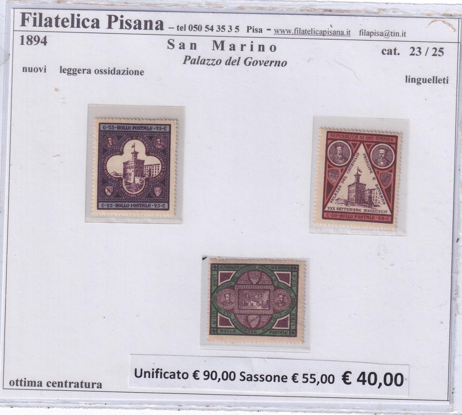 Francobolli San Marino Anno 1894 Serie completa Inaugurazione Palazzo Governo (cat. n. 23-25)
