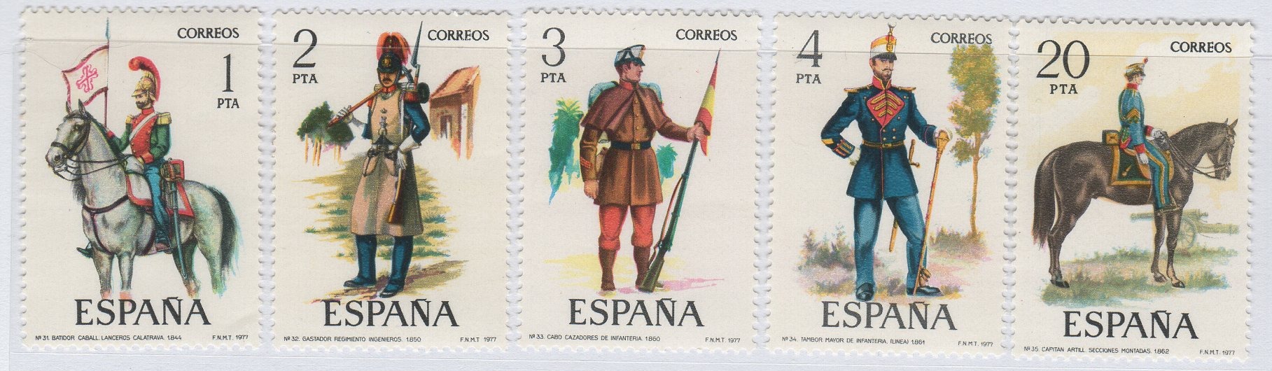 Francobolli Spagna Anno 1977 Uniformi militari Settima serie
