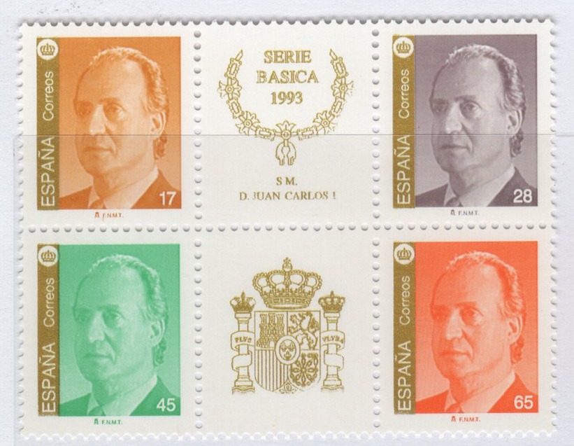Francobolli Spagna Anno 1993 Effigie del Re Juan Carlos Stampati in blocco di 4 + 2 (cat. n. 2851-2854)