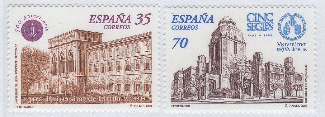 Francobolli Spagna Anno 2000 Settimo centenario dell’Università di Lerida e quinto centenario dell’Università di Valencia (cat. n. 3270-3271)
