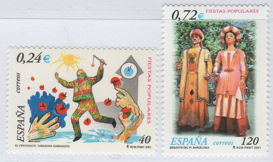 Francobolli Spagna Anno 2001 Feste popolari Cipotegato consacrazione di una chiesa Taragona e i giganti Mustafà e Elisenda Barcellona (cat. n. 3376-3377)