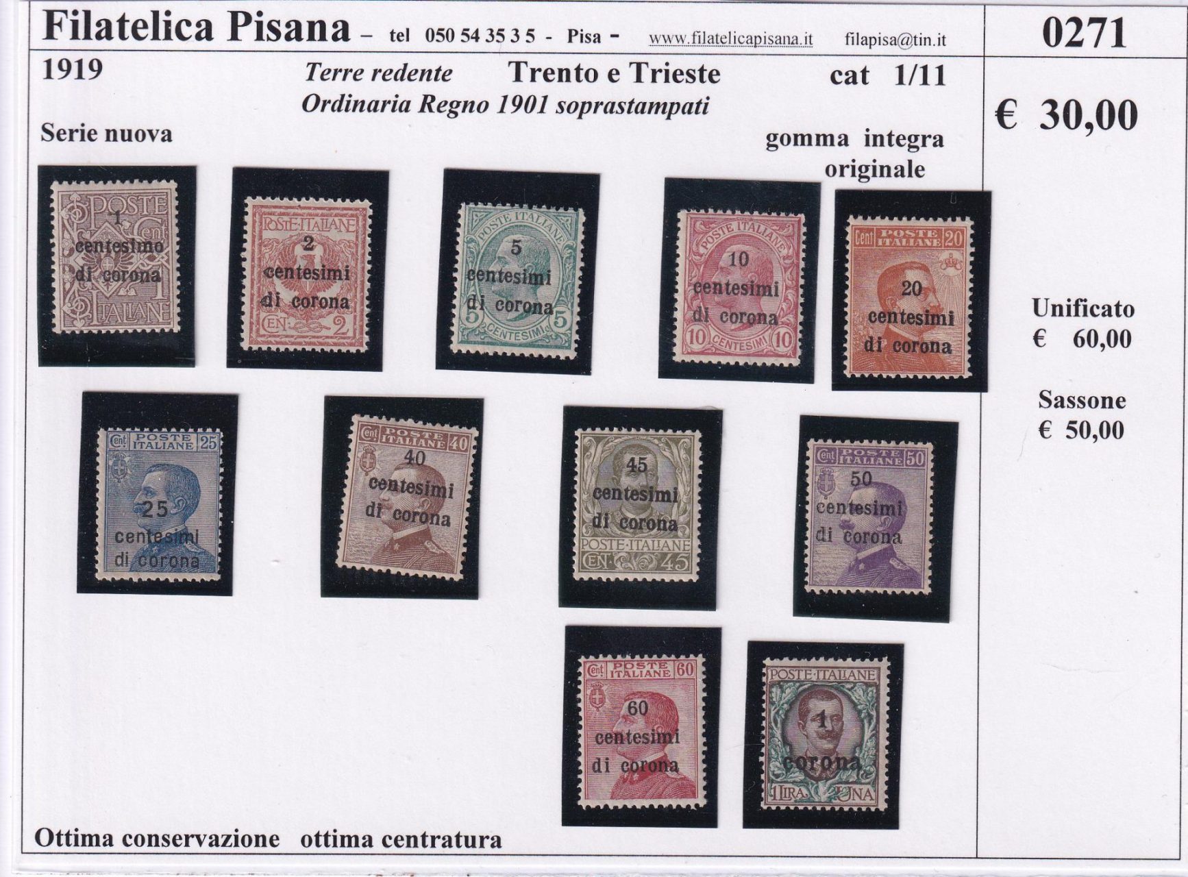 Francobolli Trento e Trieste Emissioni Generali Anno 1919 Serie Ordinaria Regno d’Italia 1901 Soprastampati (cat. n. 1-11)