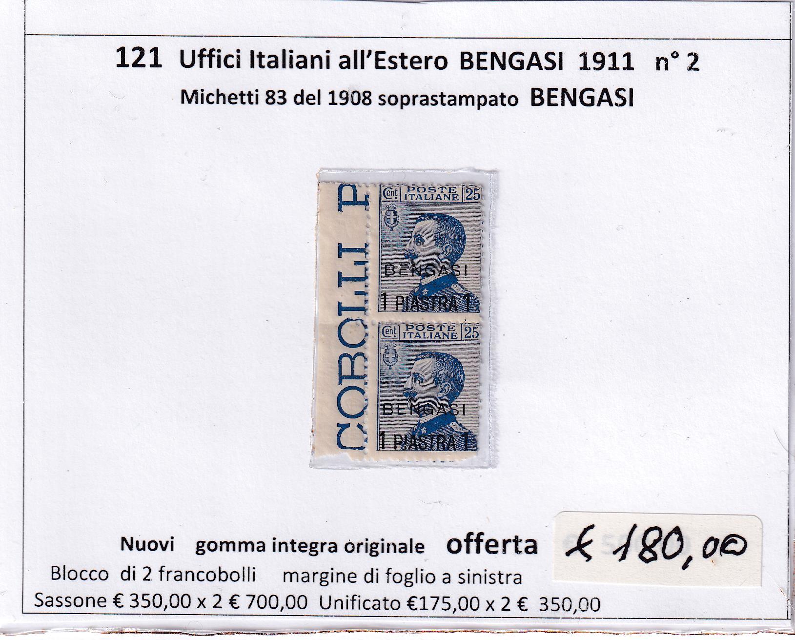 Francobolli Uffici Postali Estero Bengasi Anno 1911 Coppia Centesimi 25 azzurro Serie Michetti del 1908 Soprastampati Bengasi 1 Piastra 1 (cat. n. 2)