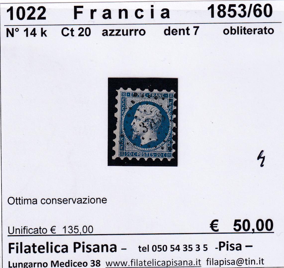 Francobollo Francia, Anni 1853-1860, Serie Effigie dell’Imperatore Napoleone III Centesimi 20 azzurro (cat. n. 14k)