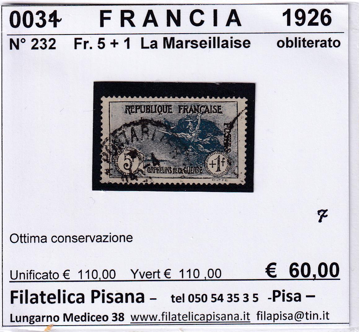 Francobollo Francia, Anni 1926-1927, Serie Pro Orfani di guerra, Seconda serie, Valore da Franchi 5 + 1 La Marseillaise (cat. n. 232)