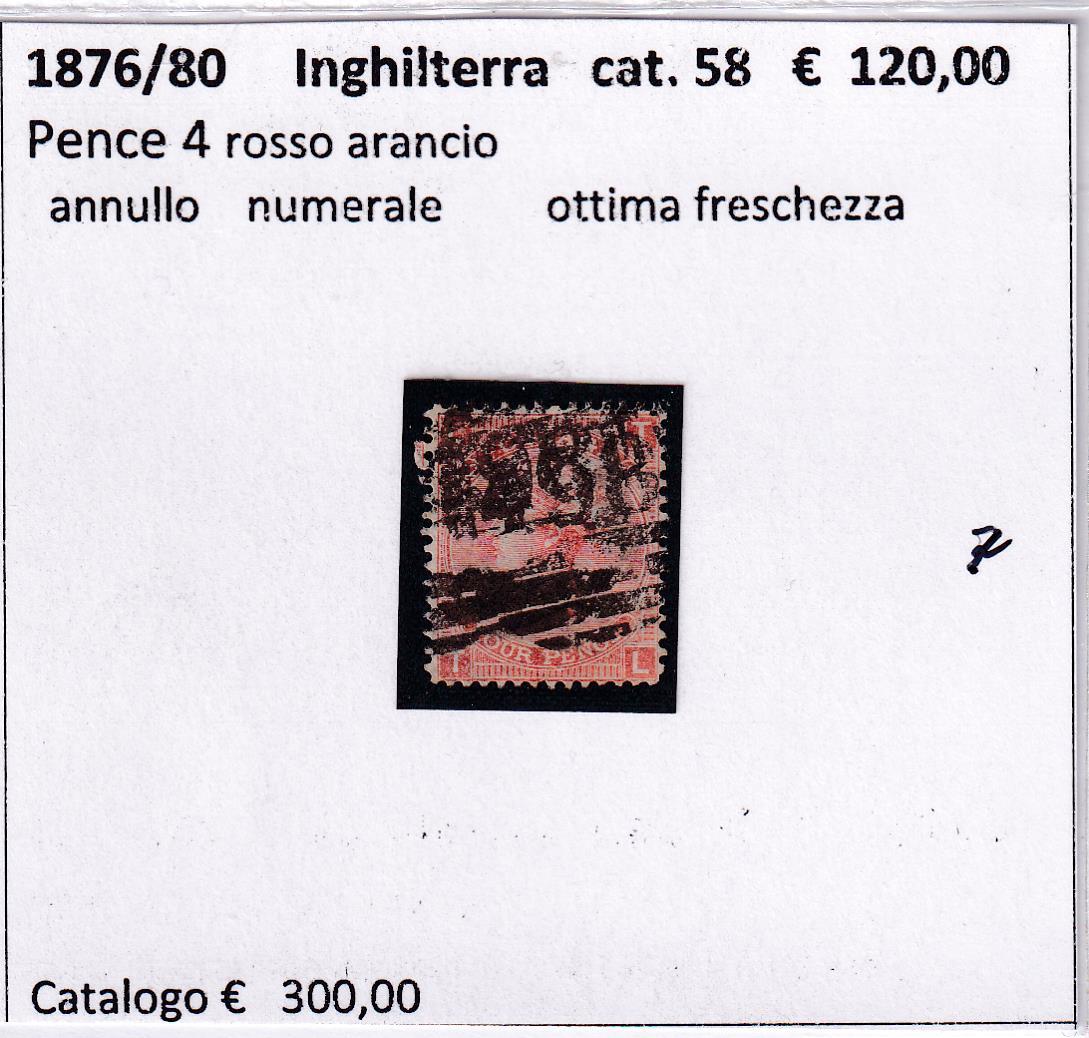 Francobollo Gran Bretagna, Anni 1876-1880, Effigie della Regina Vittoria (Nuovo Tipo) Pence 4 rosso arancio (cat. n. 58)