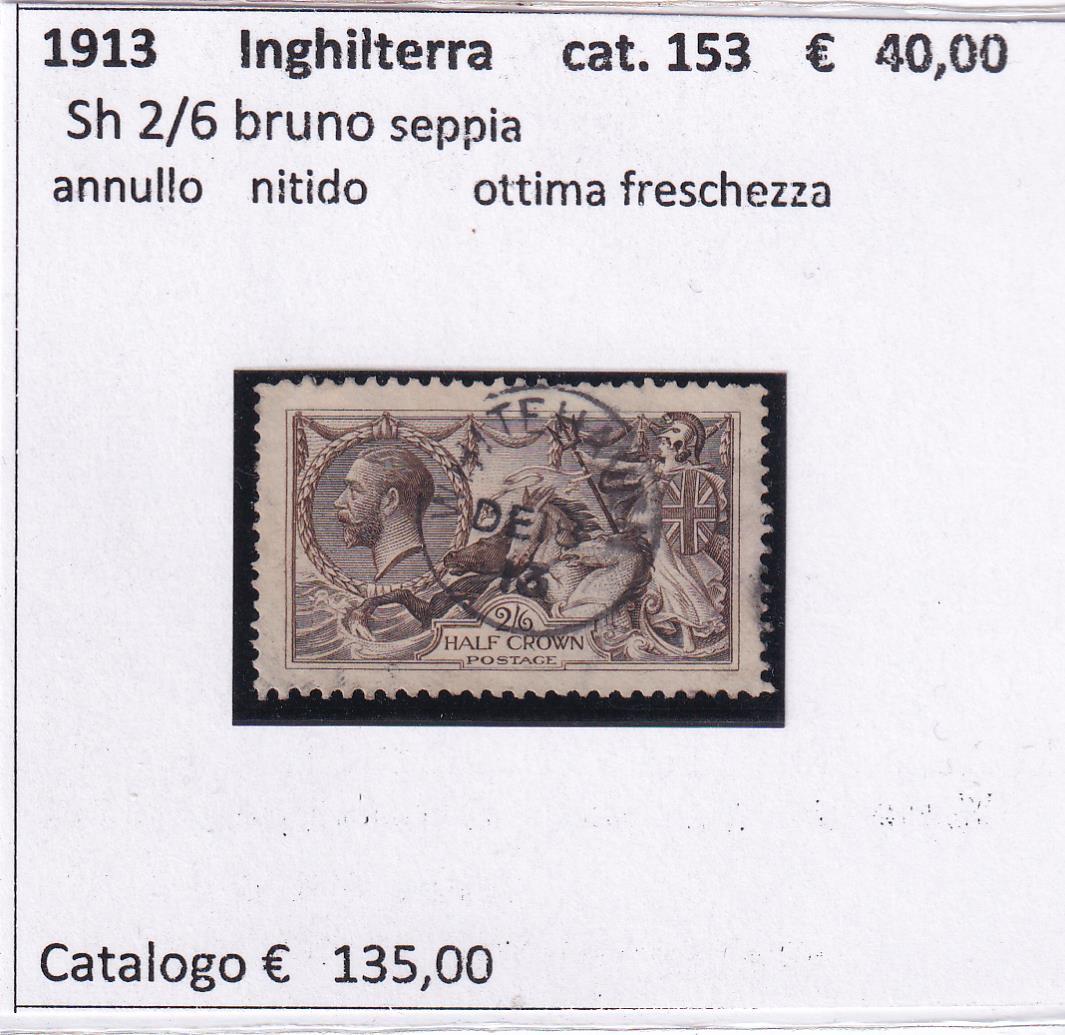 Francobollo Gran Bretagna, Anno 1913, Allegorie. Cavalli marini ed effigie di Giorgio V Shilling 2 Pence 6 bruno seppia (cat. n. 153)