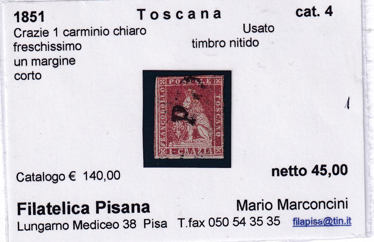 Francobollo Granducato di Toscana – Anno 1851 Crazie 1 carminio chiaro (cat. n. 4)