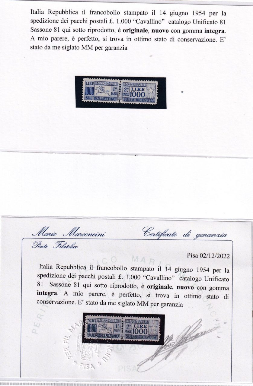 Francobollo Italia Repubblica Anno 1954 Pacchi Postali Lire 1.000 azzurro Filigrana Ruota Cavallino (cat. n. 81) con Certificato