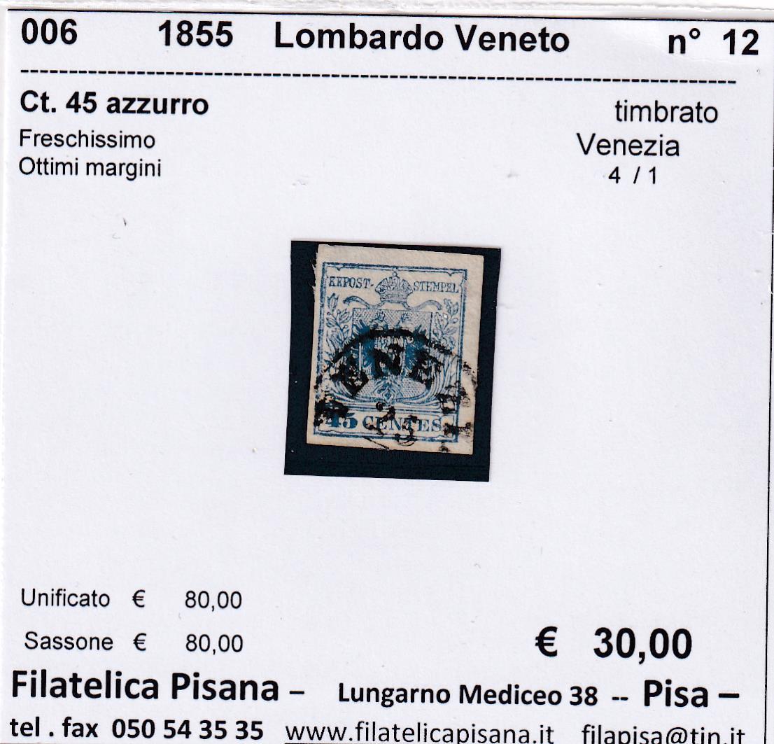 Francobollo Lombardo Veneto – Anno 1855 Centesimi 45 azzurro (cat. n. 45)