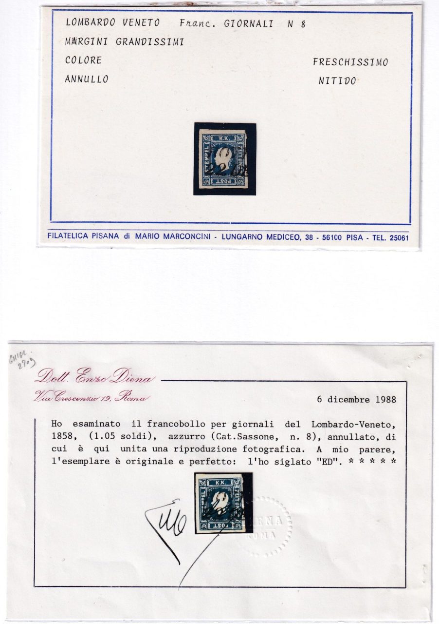 Francobollo per giornali Lombardo Veneto – Anno 1858 Soldi 1,05 azzurro (cat. n. 8)