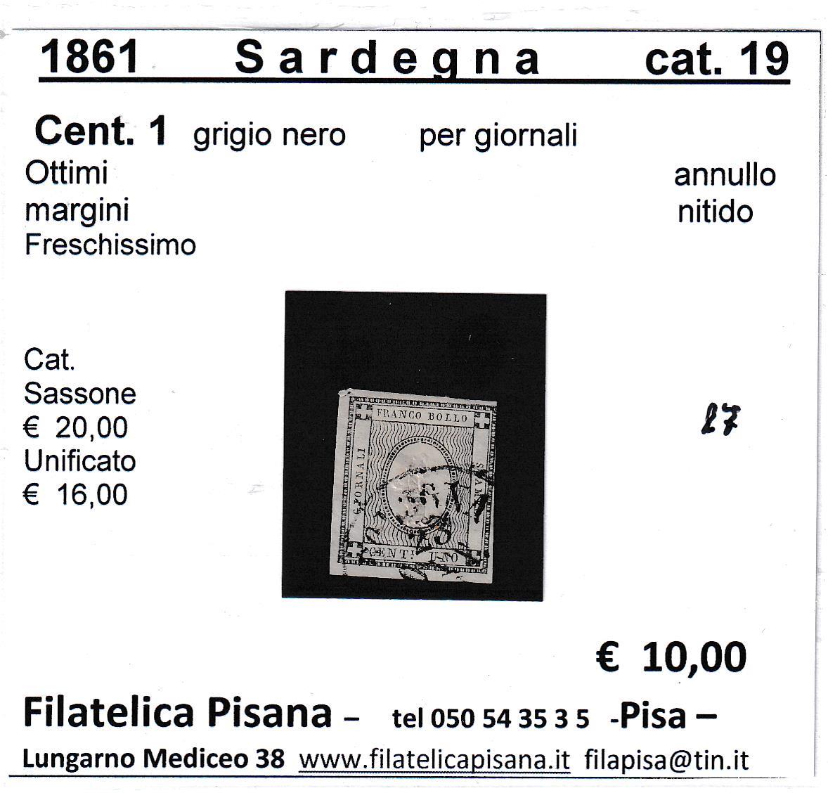 Francobollo per giornali Regno di Sardegna – Anno 1861 Centesimi 1 grigio nero (cat. n. 19)