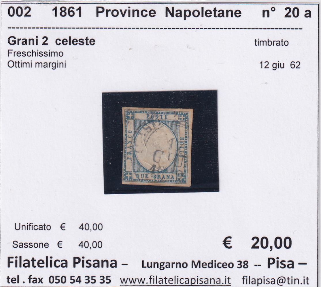 Francobollo Province Napoletane – Anno 1861 Grani 2 celeste (cat. n. 20a)
