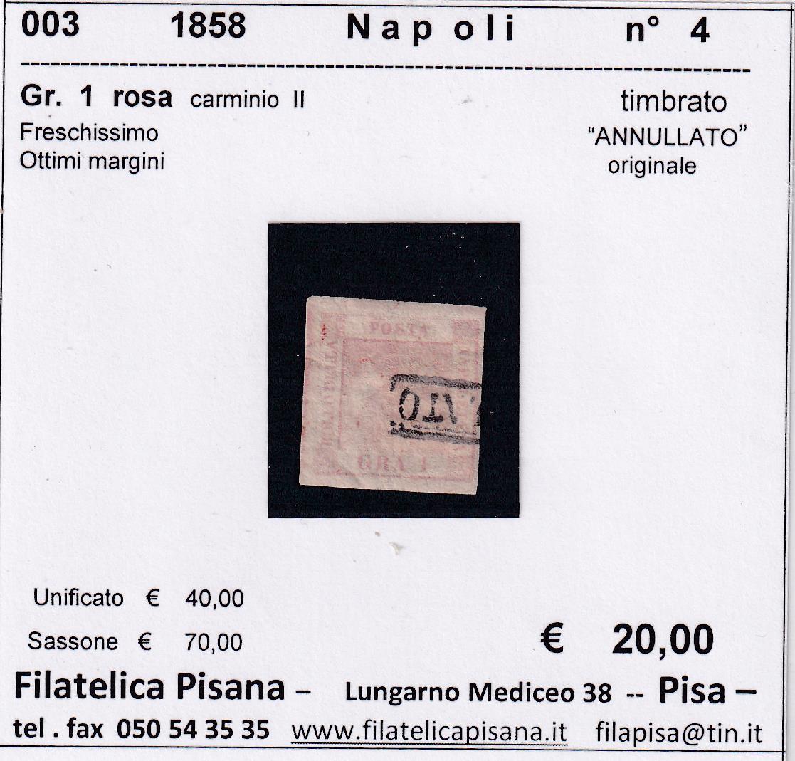 Francobollo Regno di Napoli – Anno 1858 Grani 1 rosa carminio II (cat. n. 4)