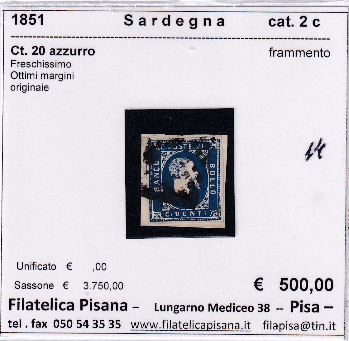 Francobollo Regno di Sardegna – Anno 1851 Centesimi 20 azzurro (cat. n. 2c)