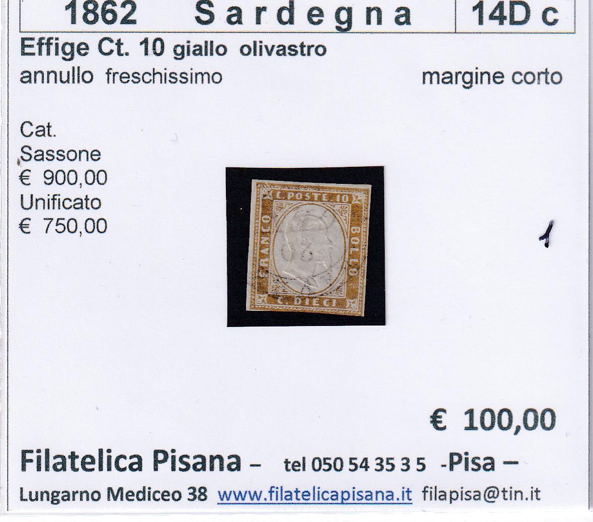 Francobollo Regno di Sardegna – Anno 1862 Centesimi 10 giallo olivastro (cat. n. 14Dc)