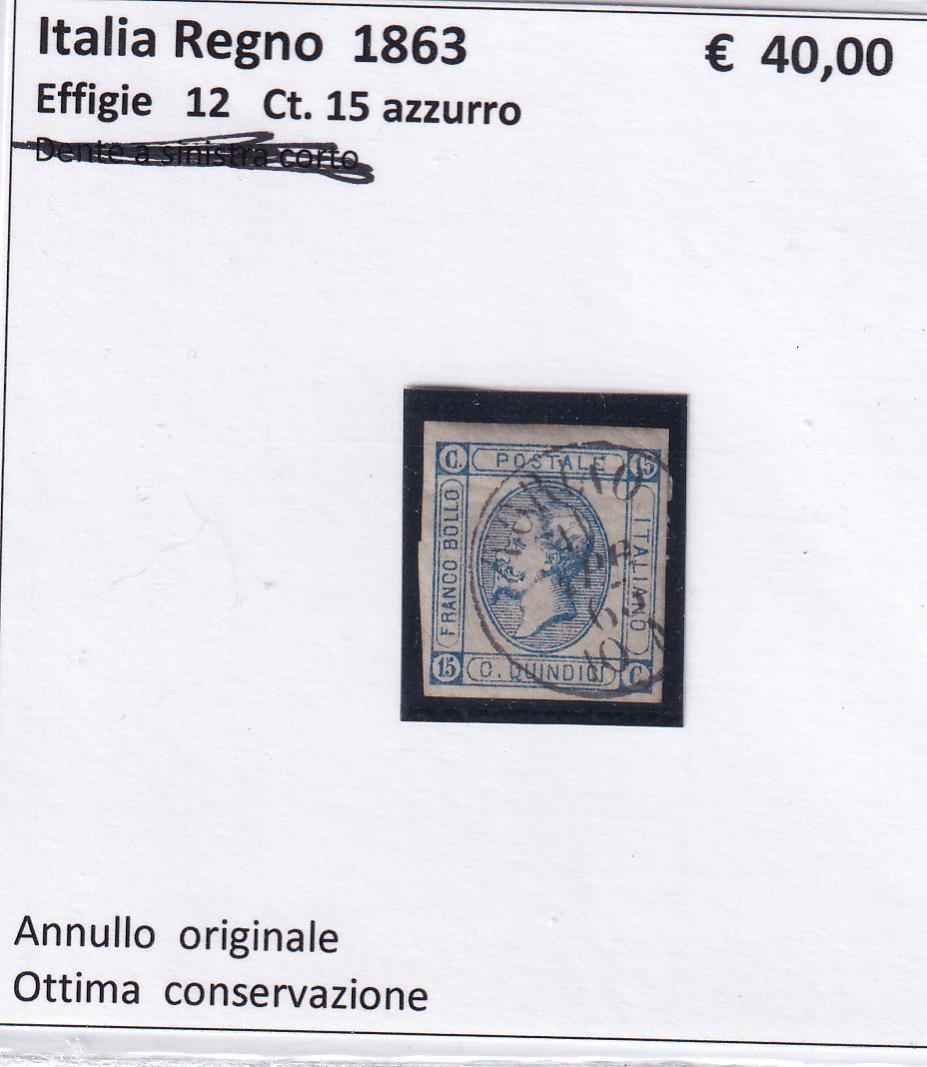 Francobollo Regno d’Italia – Anno 1863 – Effigie 15 Centesimi Azzurro