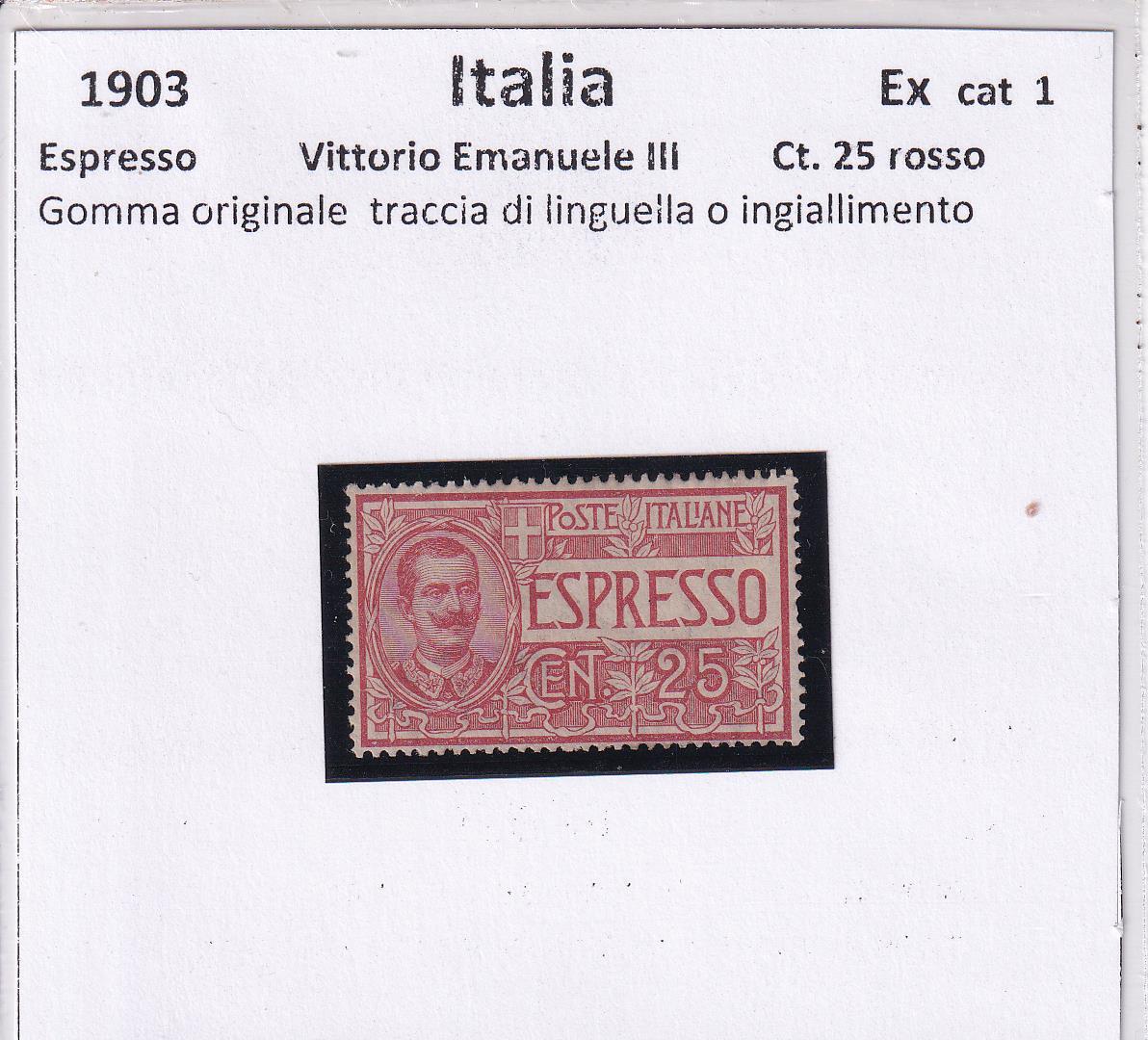 Francobollo Regno d’Italia, Anno 1903, Espresso Vittorio Emanuele III Centesimi 25 rosso (cat. Ex. n. 1)