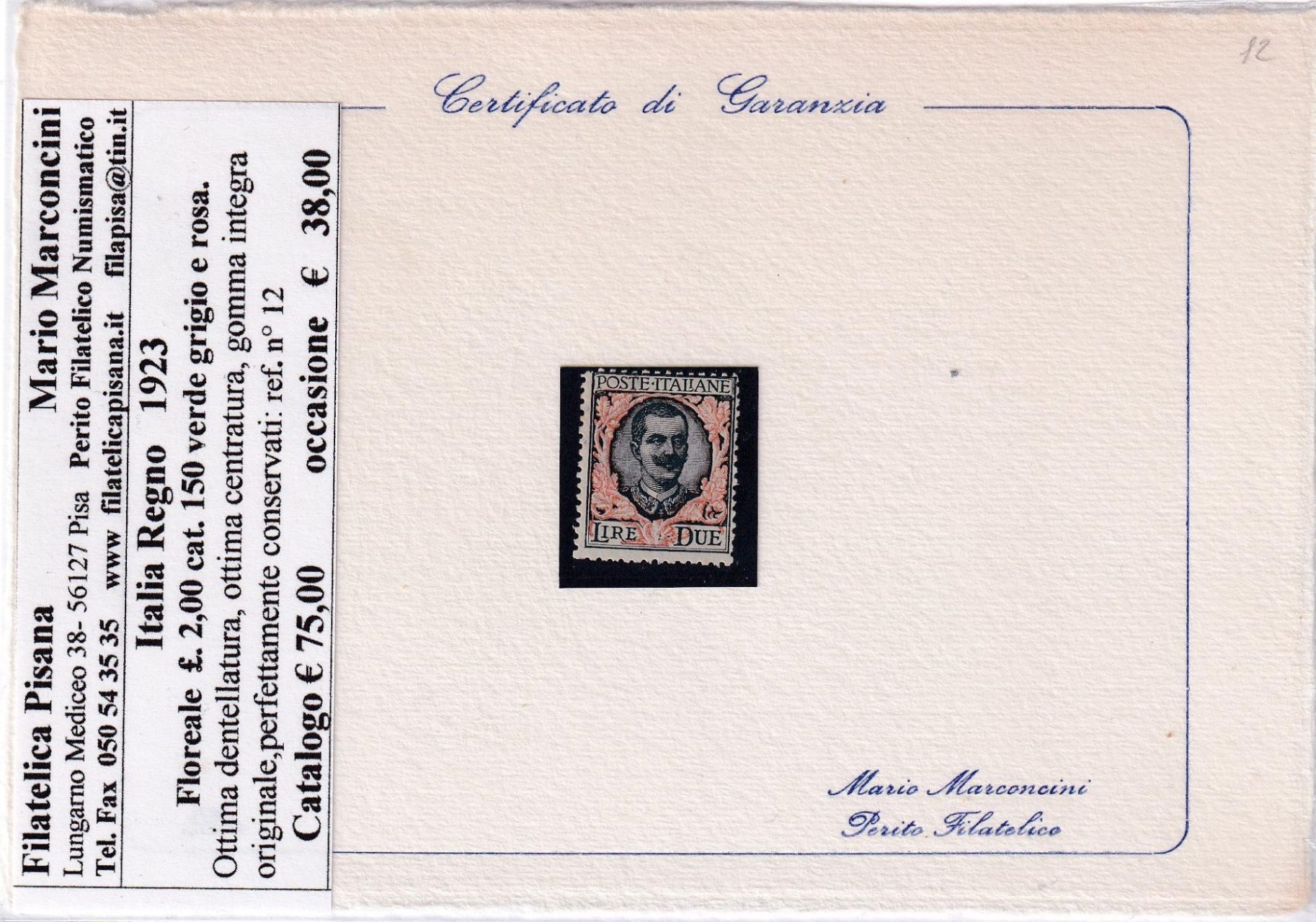 Francobollo Regno d’Italia Anno 1923 Serie Floreale Lire 2 verde grigio e arancio (cat. n. 150)
