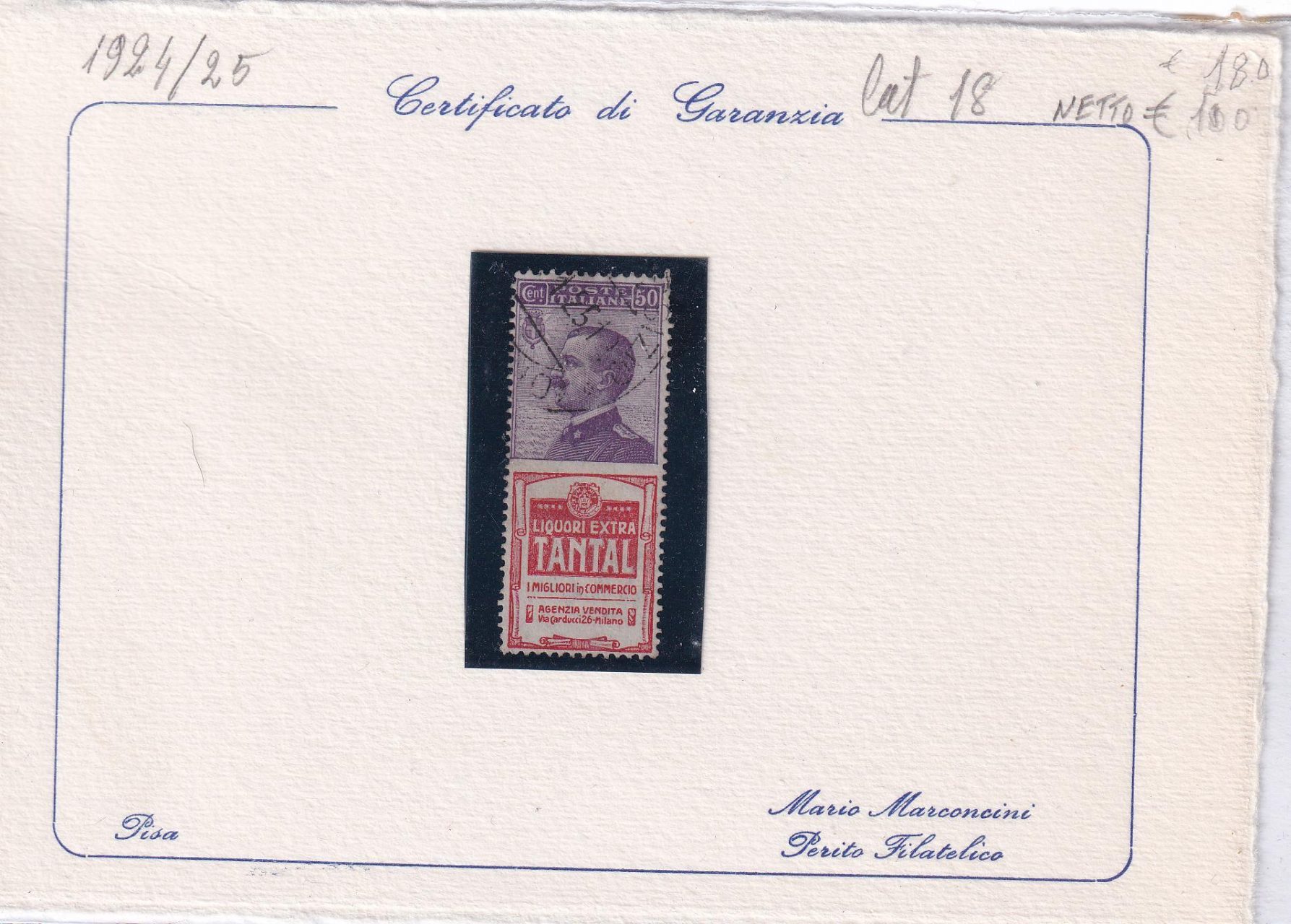 Francobollo Regno d’Italia – Pubblicitari Tantal Anno 1924 Centesimi 50 viola bruno