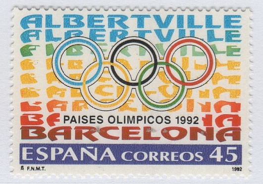 Francobollo Spagna Anno 1992 Albertville (Francia) e Barcellona (Spagna) sedi olimpiche 1992 Emissione congiunta con la Francia (cat. n. 2808)