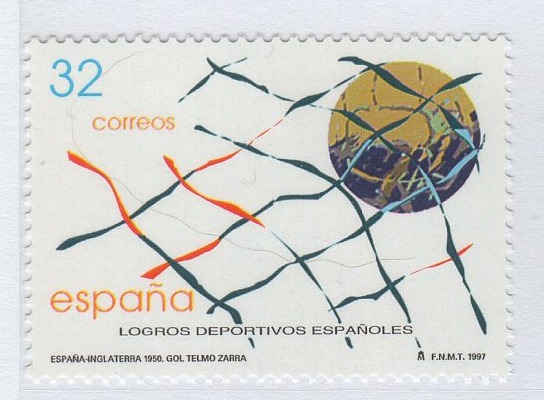 Francobollo Spagna Anno 1997 Trionfi sportivi spagnoli Vittoria calcistica sull’Inghilterra 1950 (cat. n. 3099)