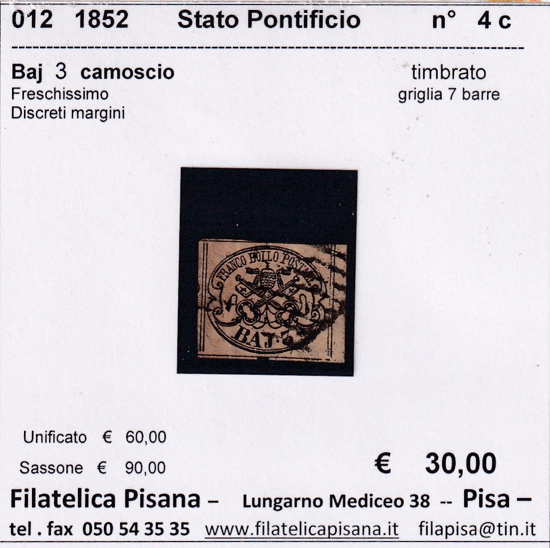 Francobollo Stato Pontificio – Anno 1852 Baj 3 camoscio (cat. n. 4c)