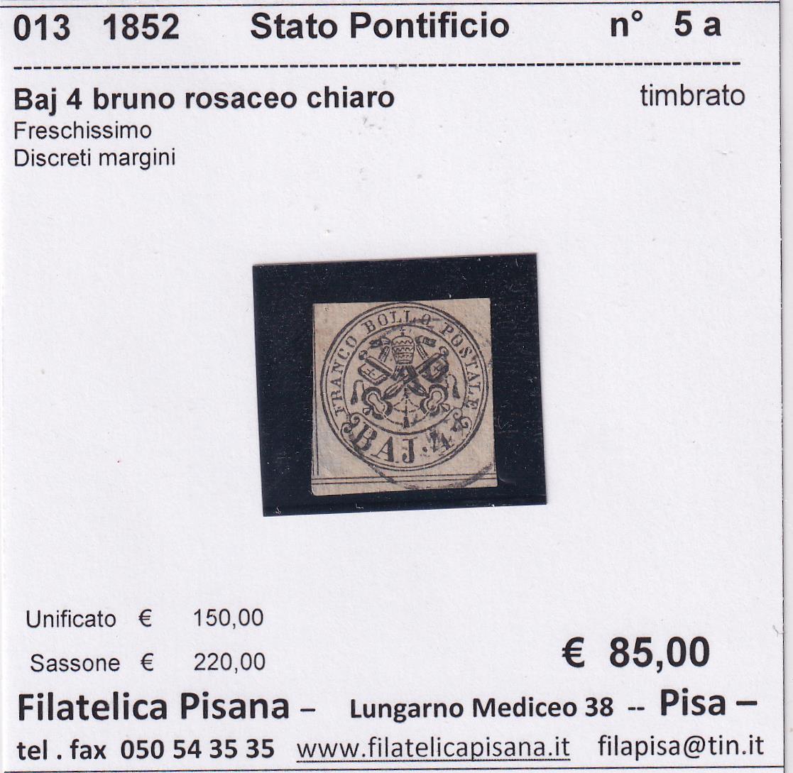 Francobollo Stato Pontificio – Anno 1852 Baj 4 bruno rosaceo chiaro (cat. n. 5a)