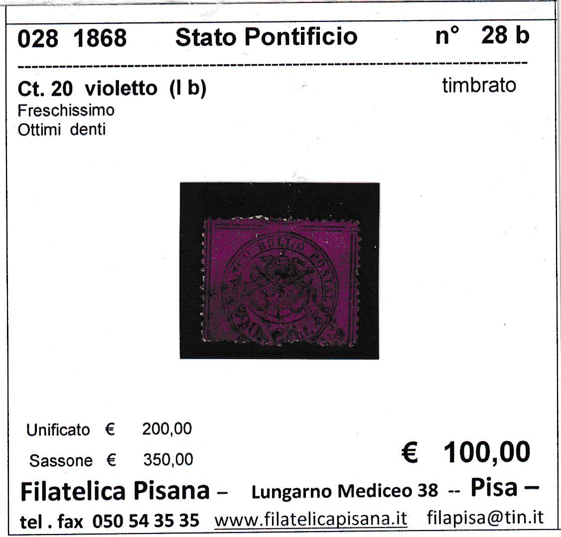 Francobollo Stato Pontificio – Anno 1868 Centesimi 20 violetto (cat. n. 28b)